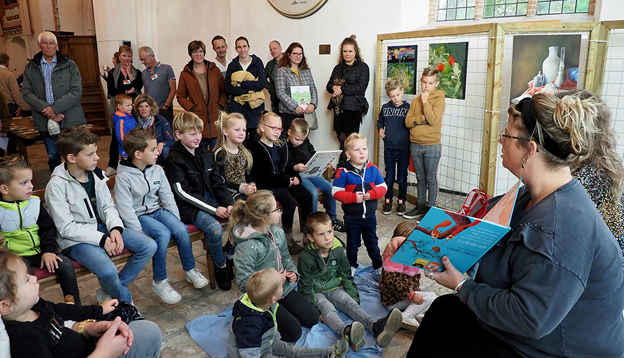 Na de opening door de wethouder en het eerste stukje op het orgel waren de kinderen aan de beurt. Voorlezen van de eekhoorns, voelen in de voeldoos en daarna samen boekenleggers maken. De 16 aanwezige kinderen hebben er van genoten.